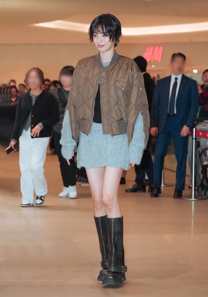 이날 나나는 케이트 니트 투피스와 경량 퀼팅 봄버을 레이어드한 러블리한 윈터룩으로 9등신 바율의 눈부신 각선미를 뽐냈다.