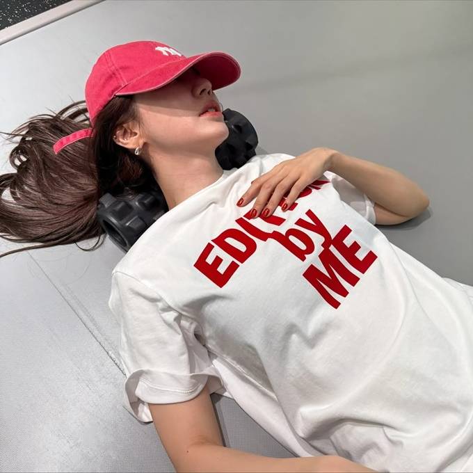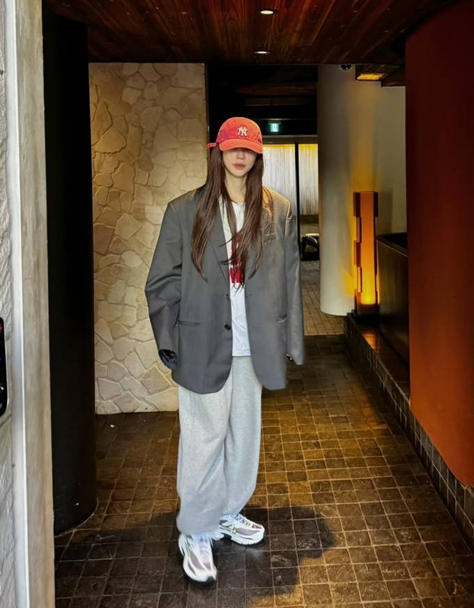 공개한 사진에서 윤은혜는 그레이 조거 팬츠에 화이트 레터링 반팔 티셔츠를 입고 오버릿 그레이 슈트 재키시을 걸친 애슬레저룩으로 힙한 스타일을 선보였다.