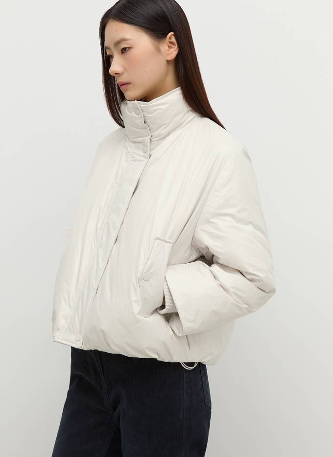'쉬즈미스'의 글로시 하이넥 덕다운 점퍼는 광택감이 돋보이는 재질의 숏패딩으로 밑단 스트링이 볼륨감 있는 실루엣을 선사한다.