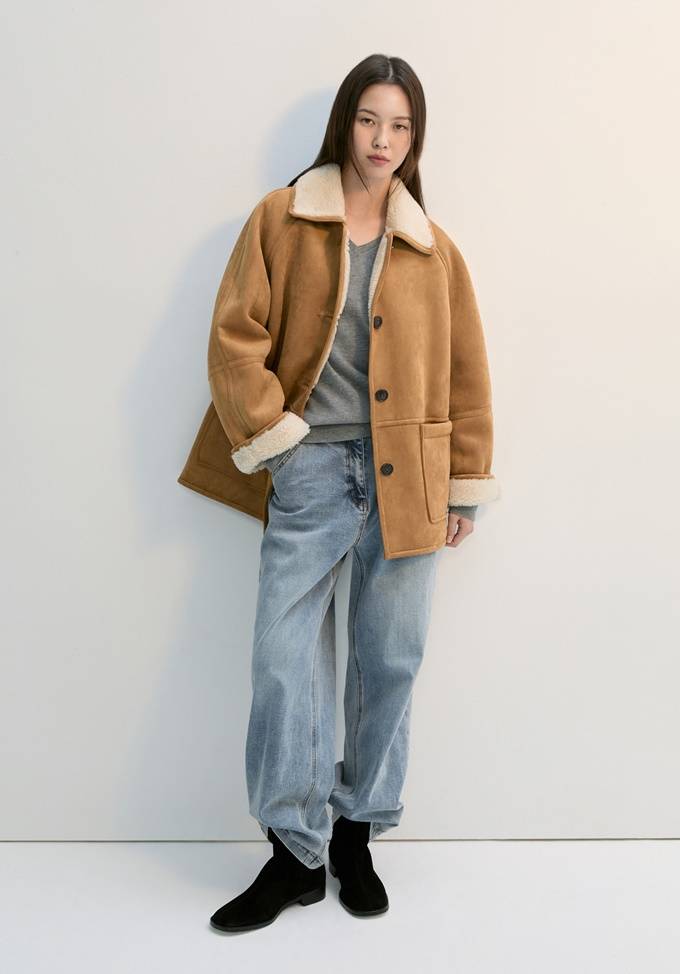 드롭 숄더의 편안함과 세련된 컬러톤이 돋보이는 무스탕 재킷으로 데님 팬츠와 매치하면 스타일리시한 윈터룩, 스커트와 매치하면 포근한 데일리 오피스룩으로 변신한다.