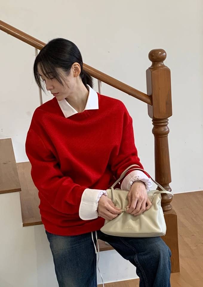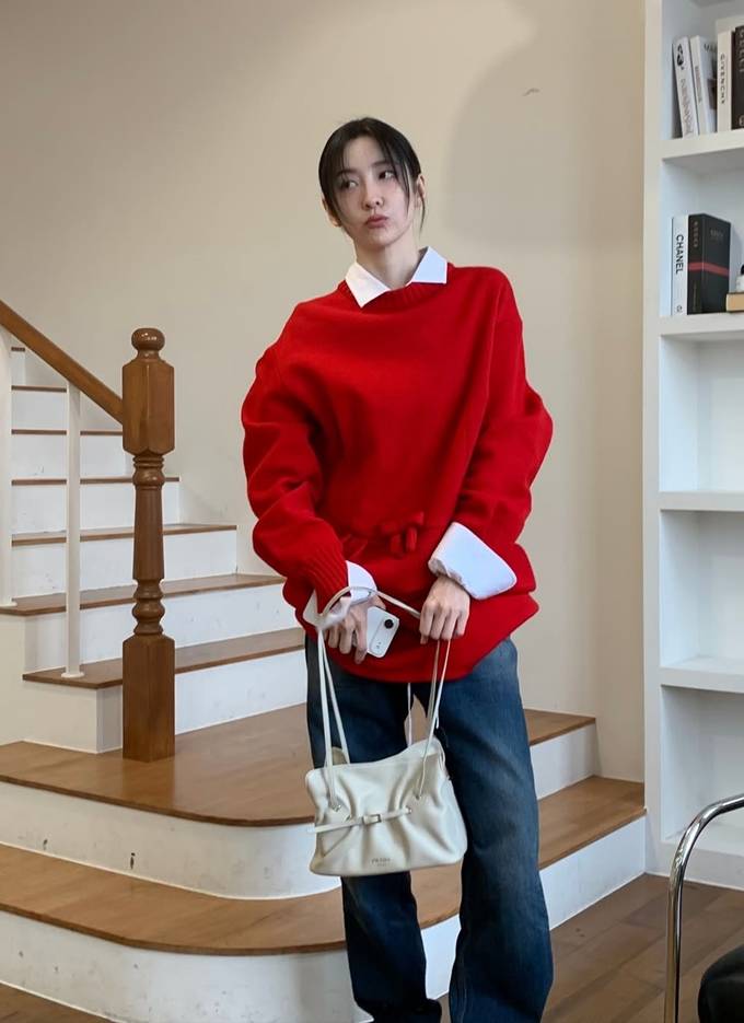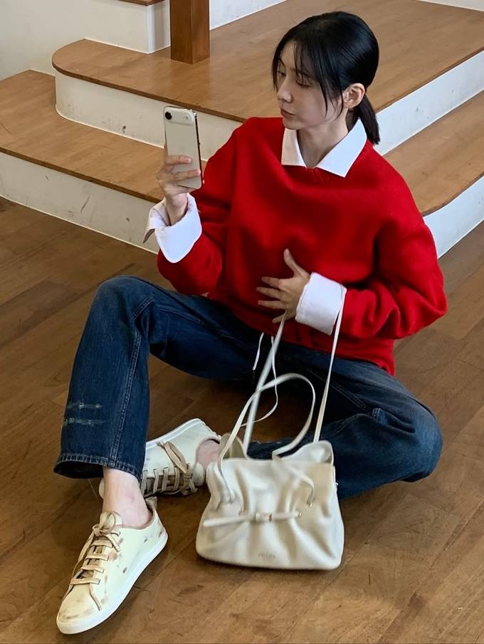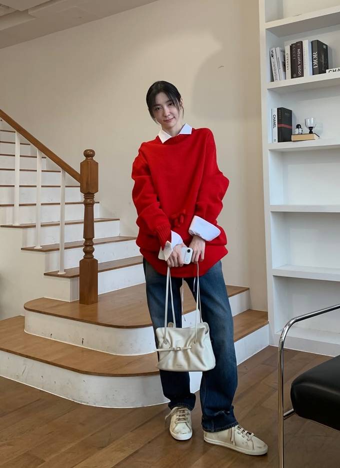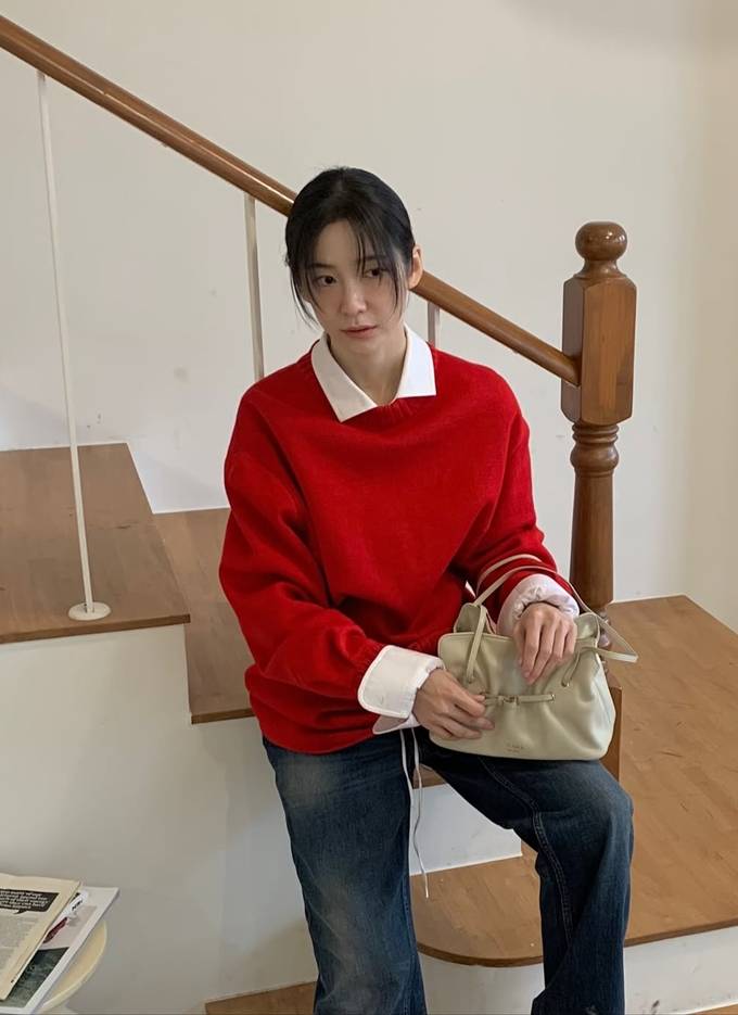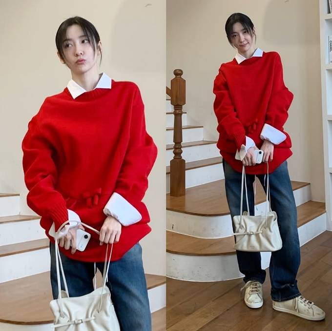 공개한 사진에서 박지현은 강렬한 레드 컬러 니트 스웨터에 화이트 셔츠를 레이어드하고 여유로운 핏의 데님 팬츠를 매치한 데일리룩으로 단순하면서도 세련된 가을 스타일을 완성했다.