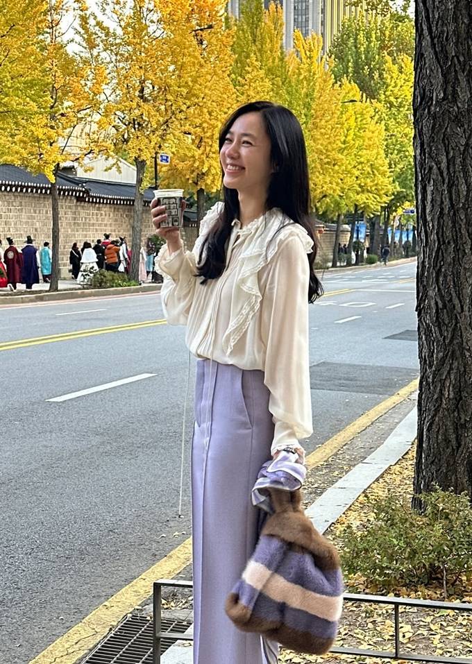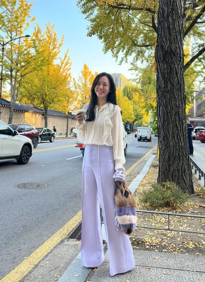 배우 박주미가 러플 블라우스와 라벤더 팬츠의 가을룩으로 가을 거리를 내추럴한 우아미로 가득 채웠다.