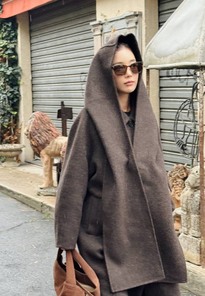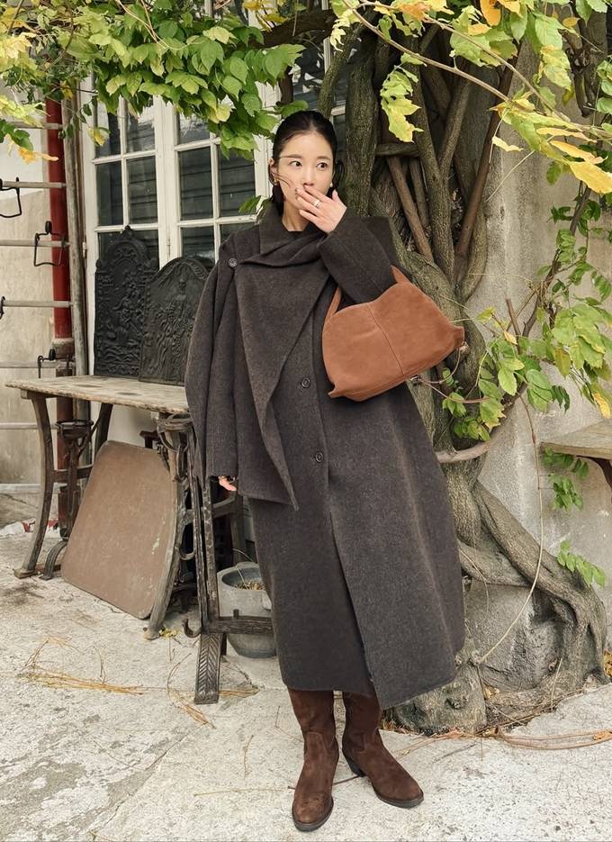 공개한 사진에서 기은세는 볼륨감 있는 실루엣의 클래식한 브라운 오버핏 롱 코트와 머플러 셋업에 데님 팬츠를 매치한 외출룩으로 실용적인 프렌치 감성을 한껏 드러냈다.