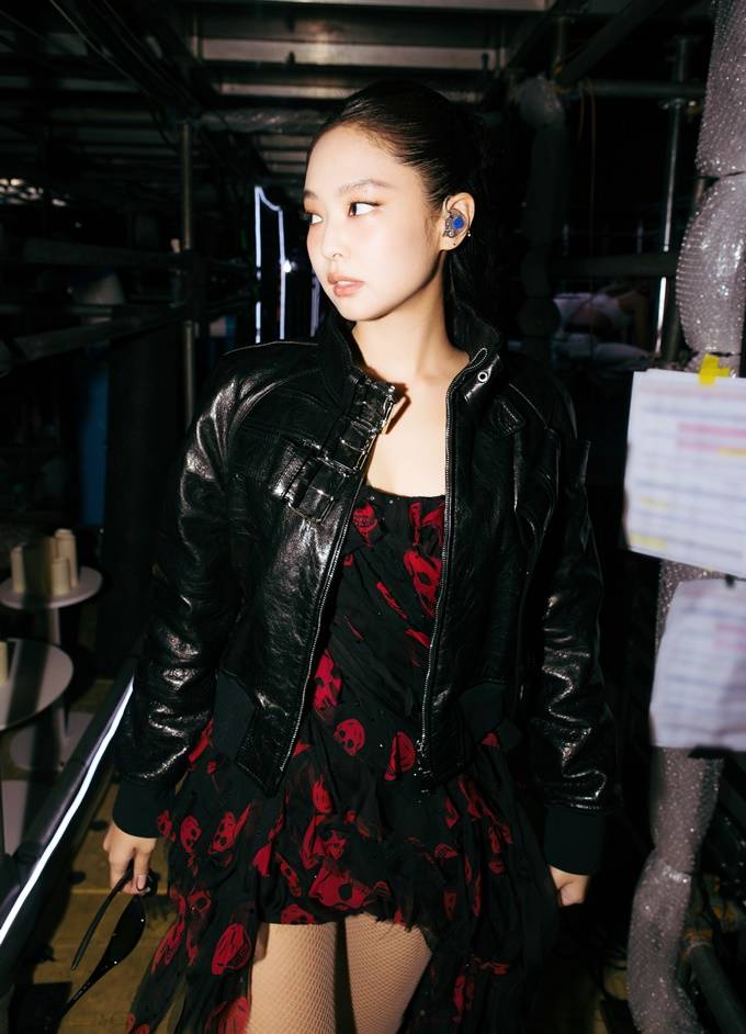 제니는 맥퀸(McQueen)와 지수는 스컬 프린트 실크 시폰 드레스와 라이더 재킷, 여기에 니 하이 부츠를 매치한 걸크러시룩으로 관객들을 사로잡았다.