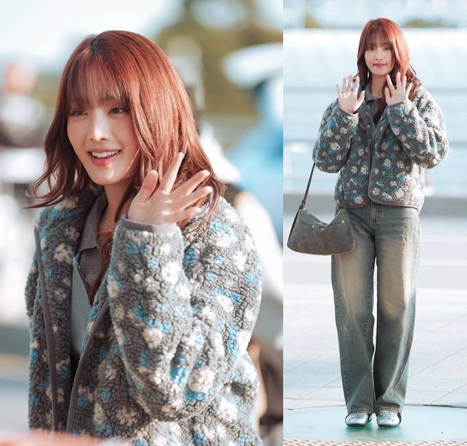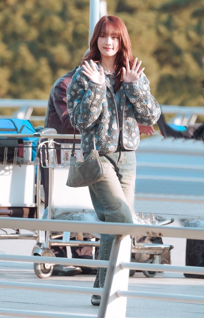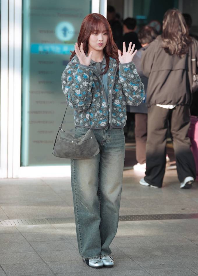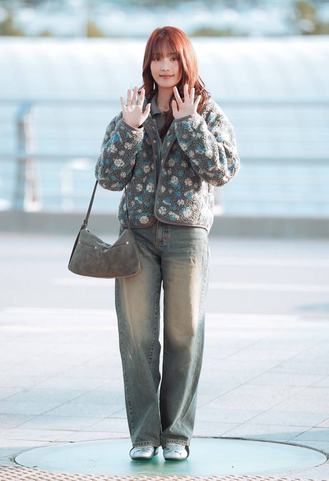 이날 민니는 잔잔한 플라워 패턴의 플리스 점퍼와 데님 팬츠를 매치한 포근한 공항패션을 연출했다.