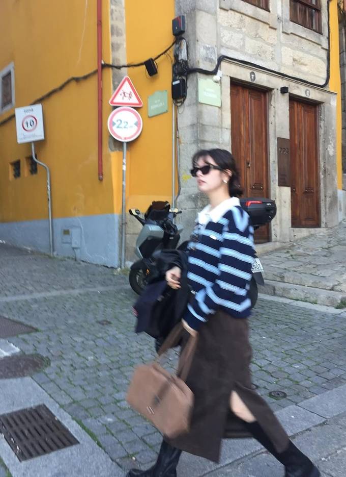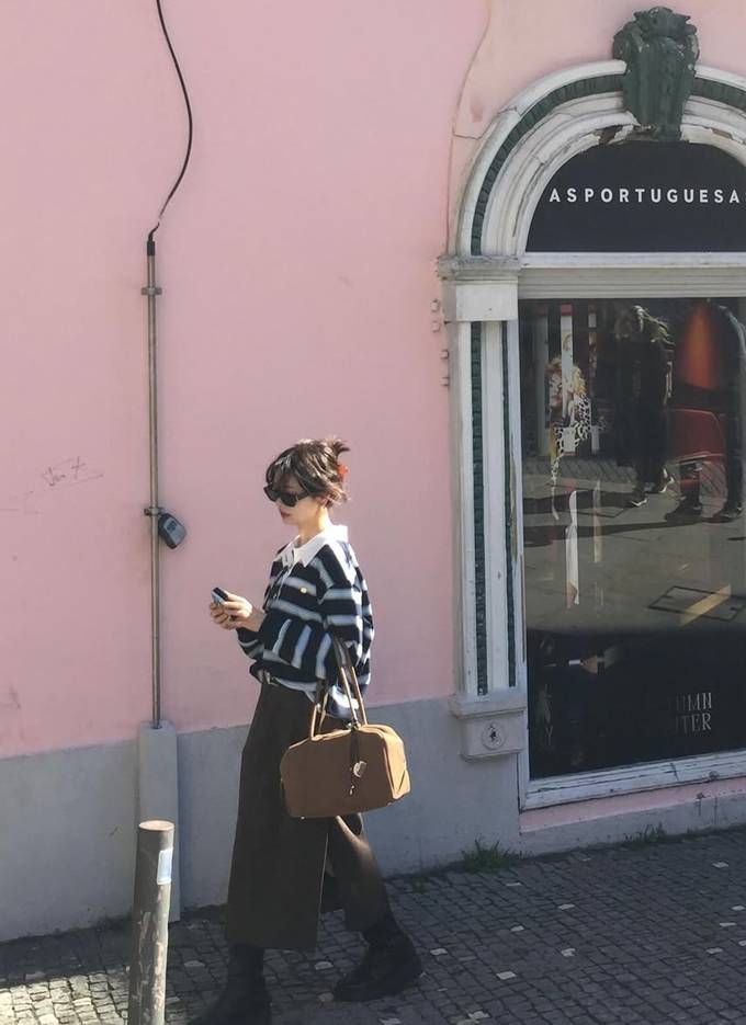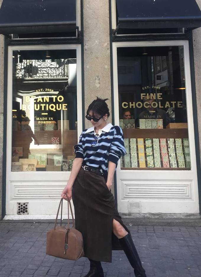 공개한 사진에서 정소민은 클래식한 네이비 스트라이프 카라 니트에 브라운 스웨이드 슬릿 롱 스커트를 매치한 여행룩으로 세련되면서도 스타일리시한 감각을 드러냈다.