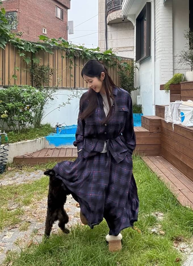 공개한 사진에서 서동주는 잔잔한 체크 패턴의 셔츠 재킷과 플리츠 롱 스커트 셋업으로 가을 감성을 가득 담은 마당 산책룩을 선보였다.