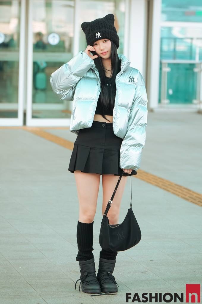 여기에 니삭스와 패딩 부츠로 스타일과 보온을 모두 챙겼으며, 블랙 숄더백으로 깔끔하게 마무리했다.