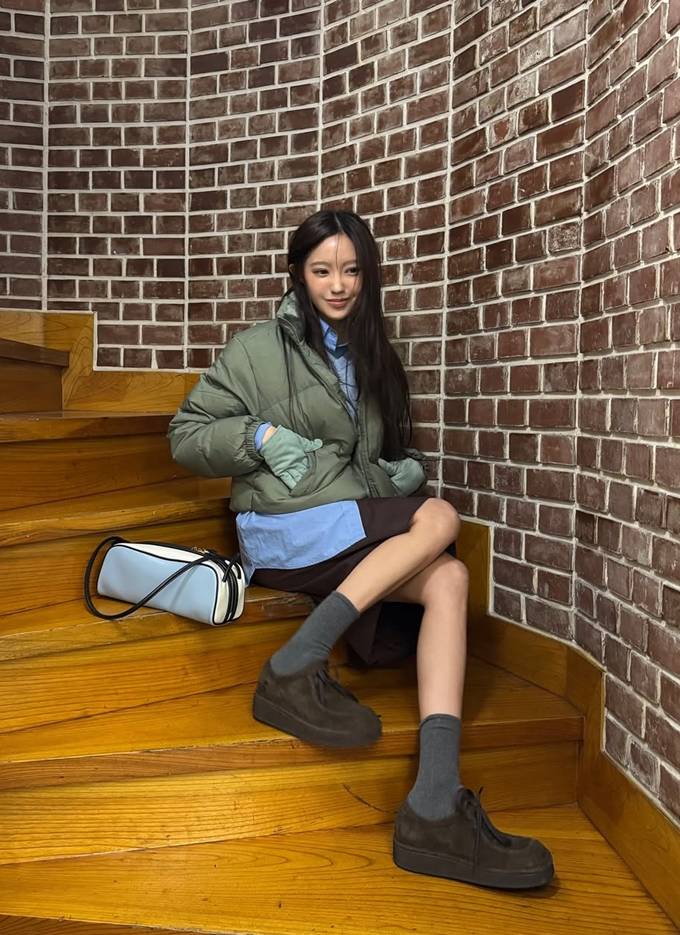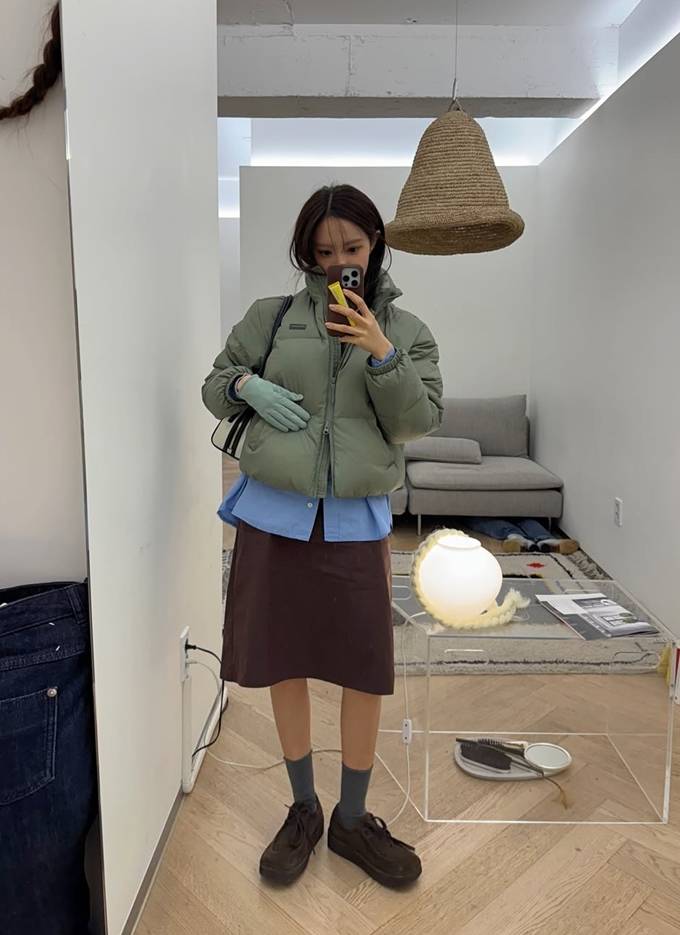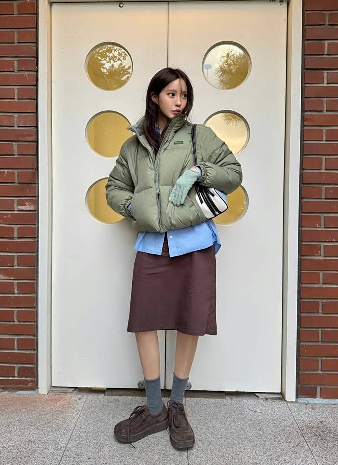 반면 민트 패딩룩에서는 블루 셔츠와 버건디 스커트를 레이어드해 부드럽고 감각적인 분위기를 자아냈다.