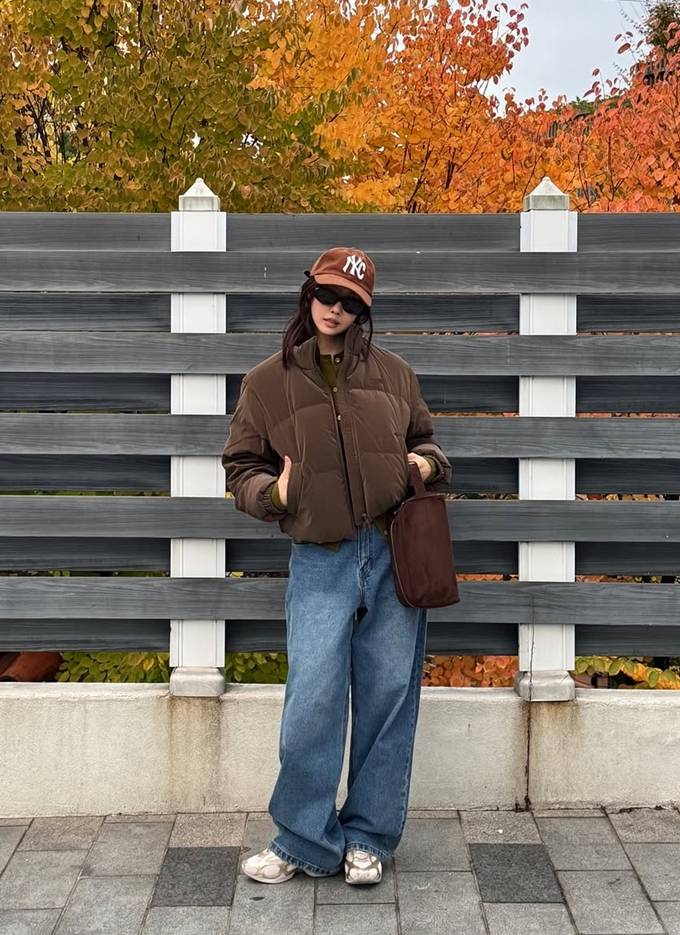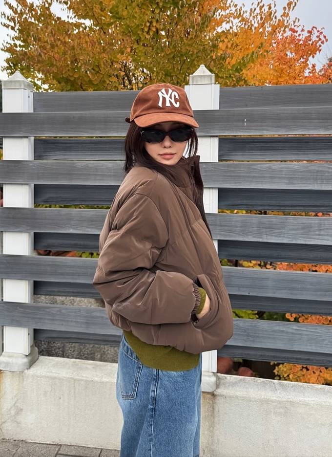 초코 브라운 패딩룩에는 카키 셔츠와 데님 팬츠, 볼캡과 선글라스를 매치해 쿨한 스트릿 감성을 연출했다.