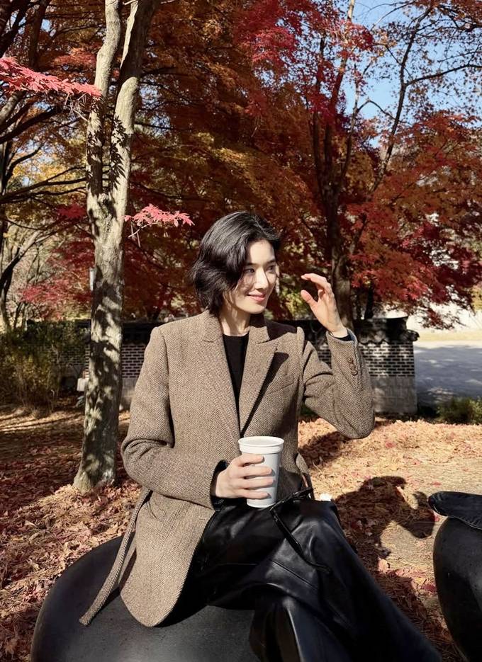 배우 정은채가 헤링본 재킷과 레더 팬츠로 러블리하면서도 시크한 가을 나들이룩을 선보였다.