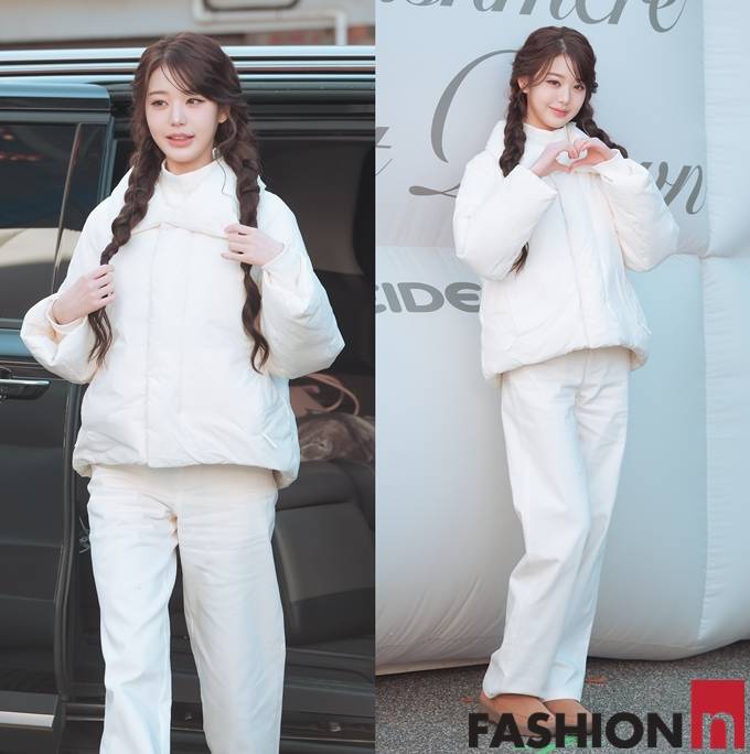 이날 장원영은 귀여운 양갈래 굵게 땋은 머리에 화이트 상의 패딩, 와이드 팬츠를 입고 브라운 어그 부츠를 매치한 올 화이트룩으로 러블리한 미모를 뽐냈다.