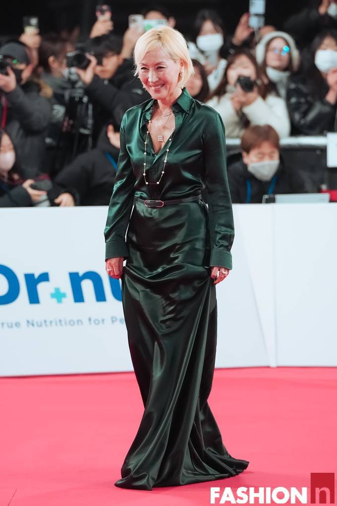 이날 이혜영은 짧은 금발 헤어 스타일에 에멜랄드 그린의 셔츠 드레스룩으로 62세 나이가 믿기지 않는 우아하면서도 카리스마 넘치는 분위기를 자아냈다.