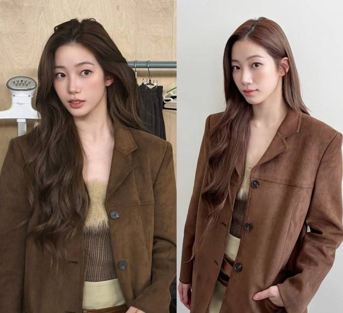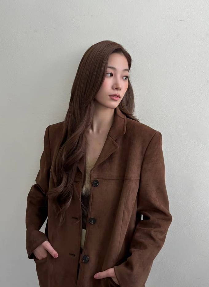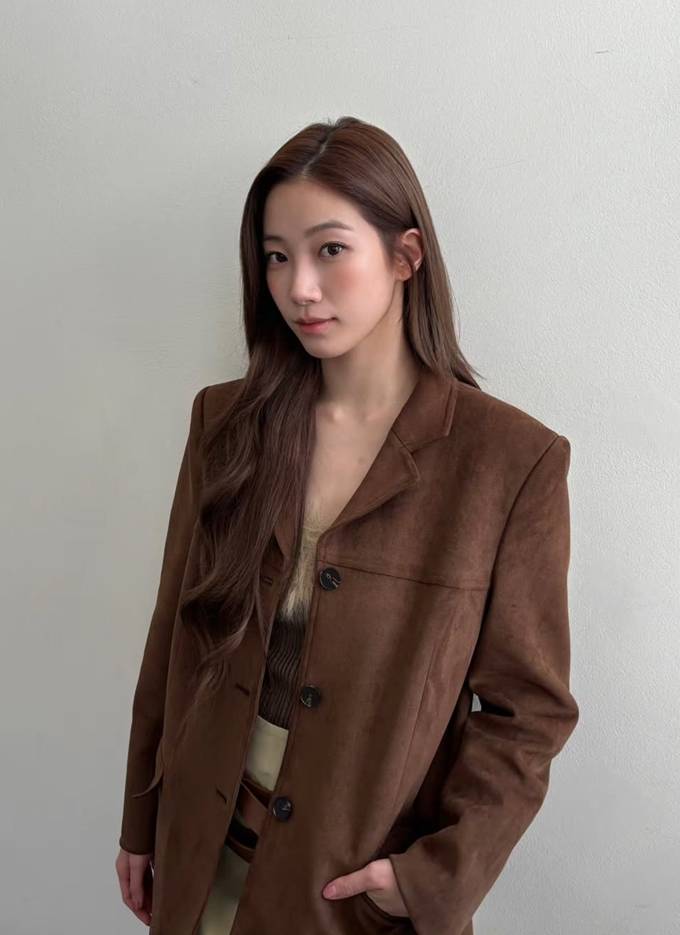 공개한 사진에서 카즈하는 모카무스 컬러의 스웨이드 재킷에 같은 톤의 이너 톱과 하의를 매치해 차분하면서도 세련된 가을 스타일을 완성했다.