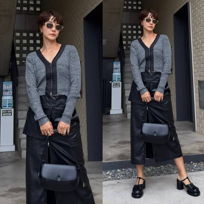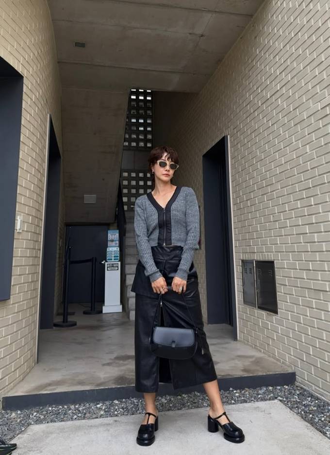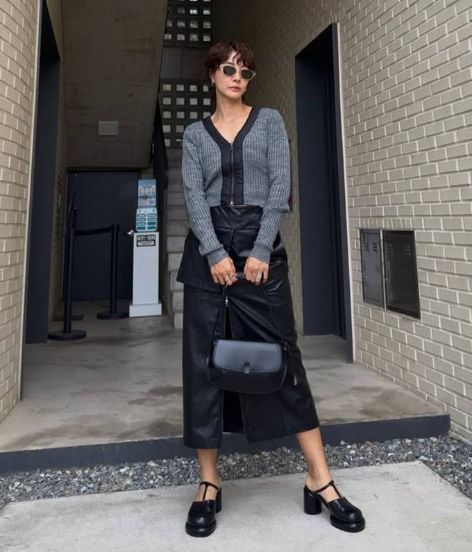 전서연은 앞트임이 있는 슬릿 블랙 레더 롱 스커트에 슬림한 핏의 그레이 니트 집업 카디건을 매치해 톤온톤 스타일의 하이엔드 모노크롬룩을 완성했다.