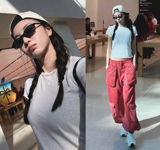 또 양갈래로 땋은 머리에 볼캡을 매치한 힙한 스타일로 걸리시한 매력을 한껏 드러냈다.