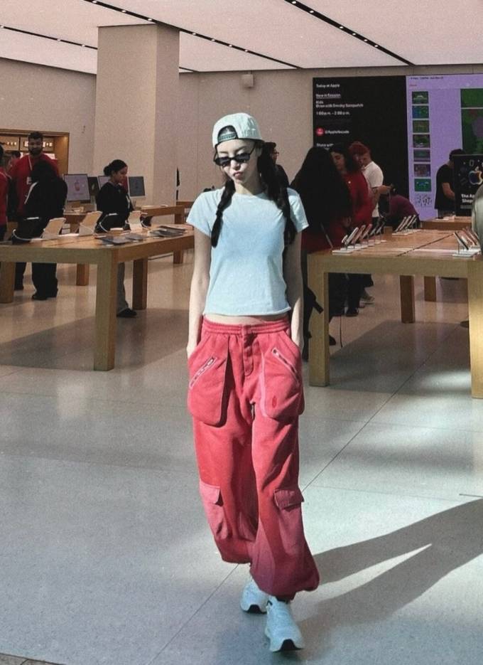 김윤지는 허리 라인이 살짝 드러난 화이트 크롭 티셔츠에 여유로운 실루엣과 커다란 포켓디테일이 돋보이는 레드 카고 팬츠를 매치한 슬림한 실루엣으로 트렌디하면서도 힙한 걸리시룩을 완성했다.