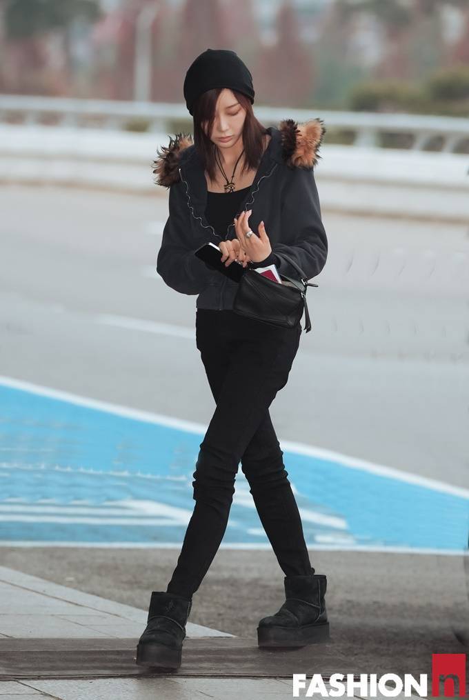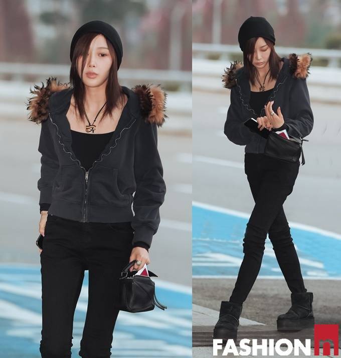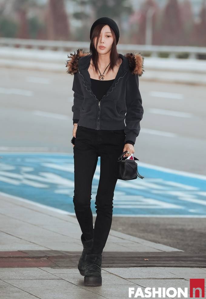 이날 지젤은 퍼 후드 집업 재킷과 블랙 팬츠를 매치한 힙한 윈터룩으로 눈길을 사로잡았다.