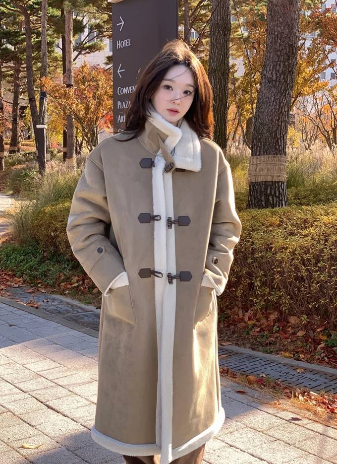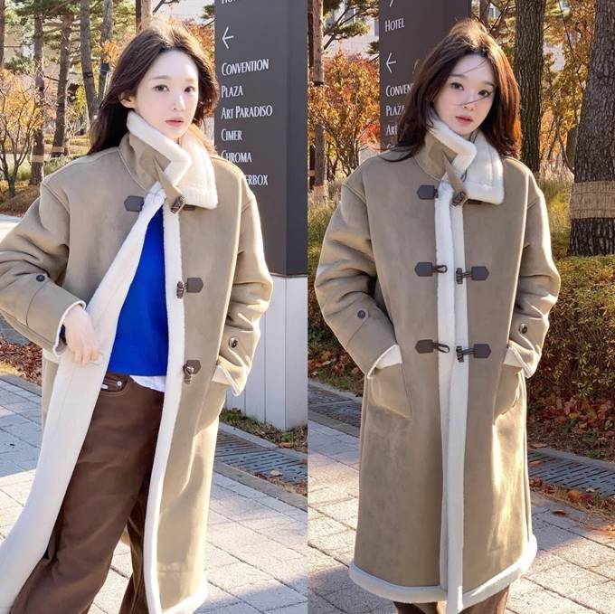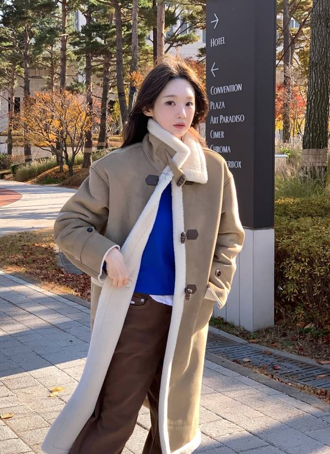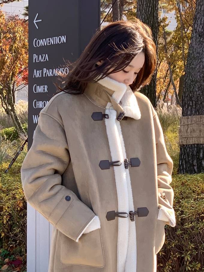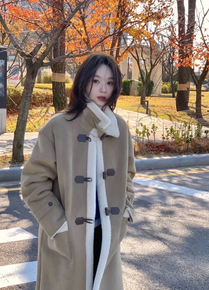 여성 듀오 그룹 다비치의 강민경이 이불 밖으로 나오기 싫은 날 포근한 하이넥 무스탕 코트로 외출을 감행했다.