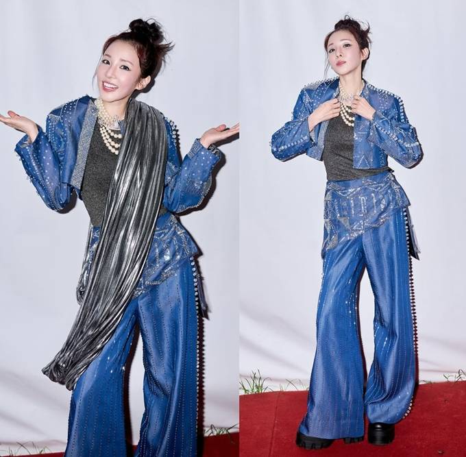 산다라박은 보석 장식과 스터드 디테일이 가득한 오버핏 재킷과 와이드 팬츠를 매치한 페스티벌룩으로 특유의 빈티지함과 과감하면서도 화려한 감각을 한껏 드러냈다.