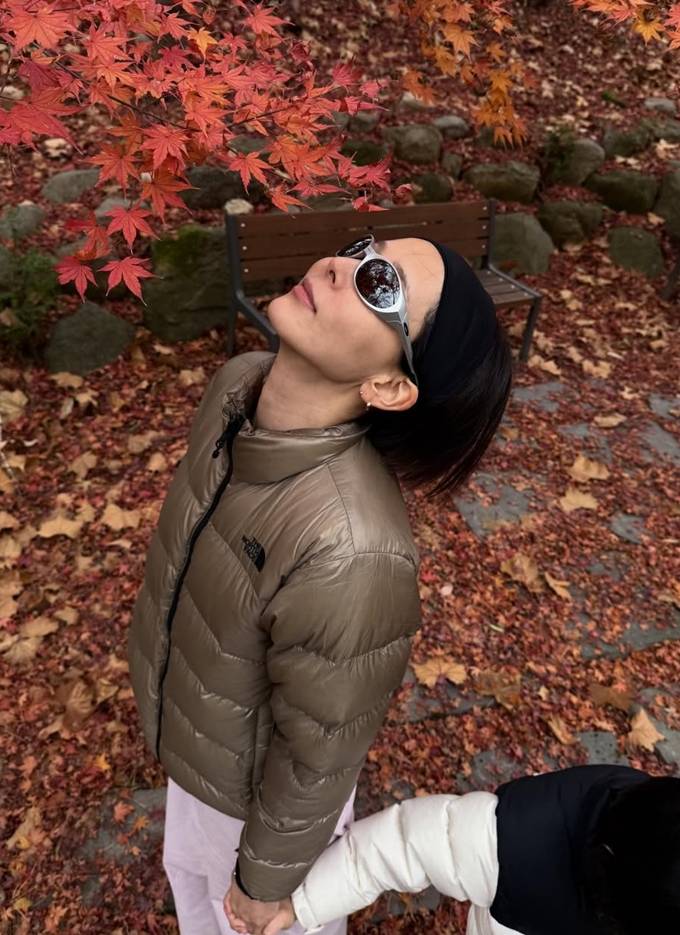 공개한 사진에서 김나영은 니트 비니에 블루 컬러의 숏패딩과 카멜 컬러의 숏패딩에 헤어밴드와 선글라스를 매치한 꾸안꾸 스타일의 산책룩을 선보였다.