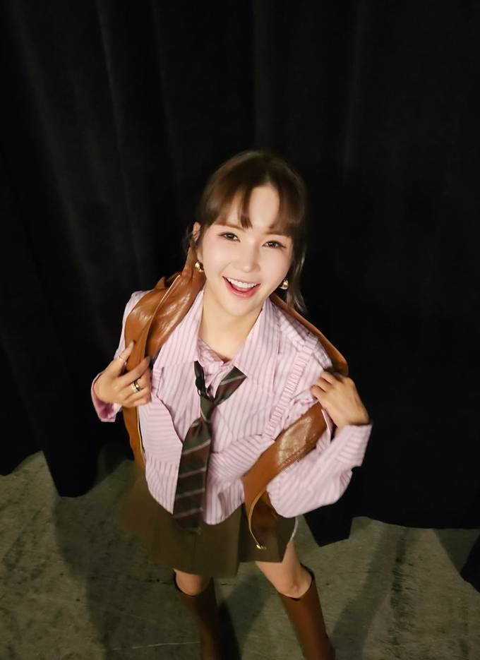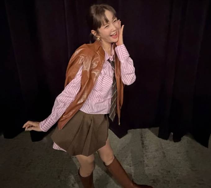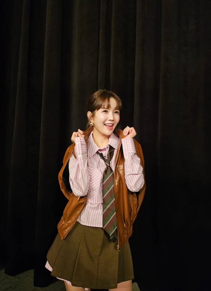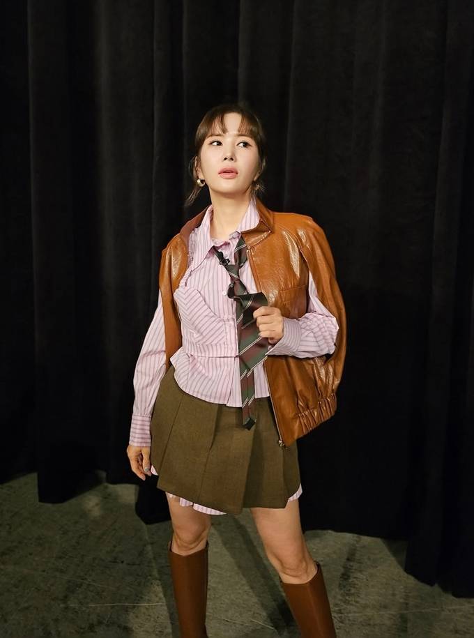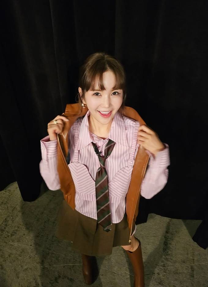 공개한 사진에서 장영란은 핑크 톤의 스트라이프 셔츠에 타이를 매고 브라운 레더 베스트를 입고 카키톤의 플리츠 미니 스커트를 매치해 발랄함과 세련미 넘치는 프레피룩을 완성했다.