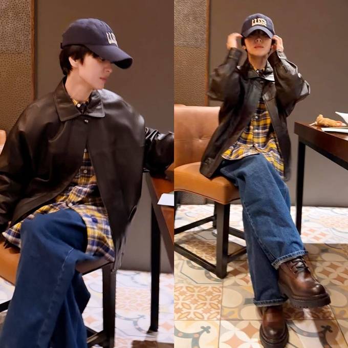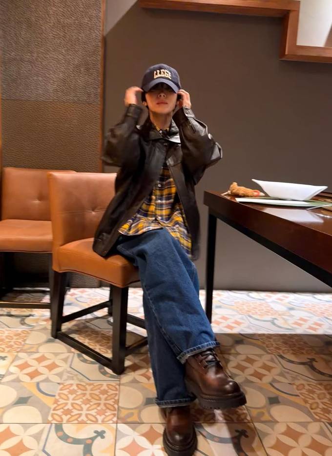 공개한 사진에서 송혜교는 옐로와 네이비 체크 셔츠와 일자 와이드 데님 팬츠를 입고 여유로운 실루엣의 레더 재킷을 걸친 외출룩으로 모던하면서도 보이시한 데이트룩을 완성했다.