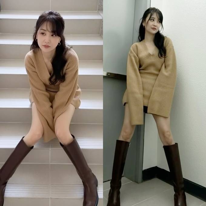 공개한 사진과 영상에서 박하선은 초미니 블랙 쇼츠 위에 오버핏 카멜 니트 스웨터를 착용한 하의실종 스타일로 과감하면서도 섹시한 출근룩을 완성했다.