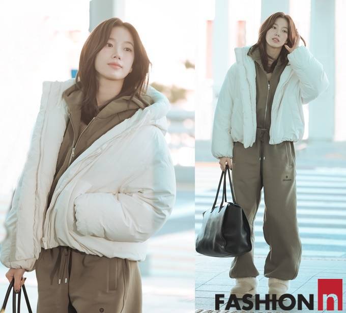 [패션엔 포토] 르세라핌 카즈하, 포근한 대만 출국길! 점프슈트 위에 툭 걸친 화이트 숏패딩룩