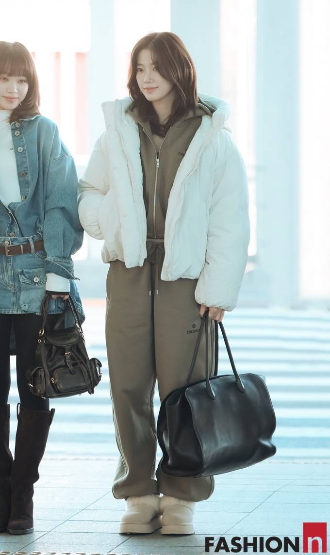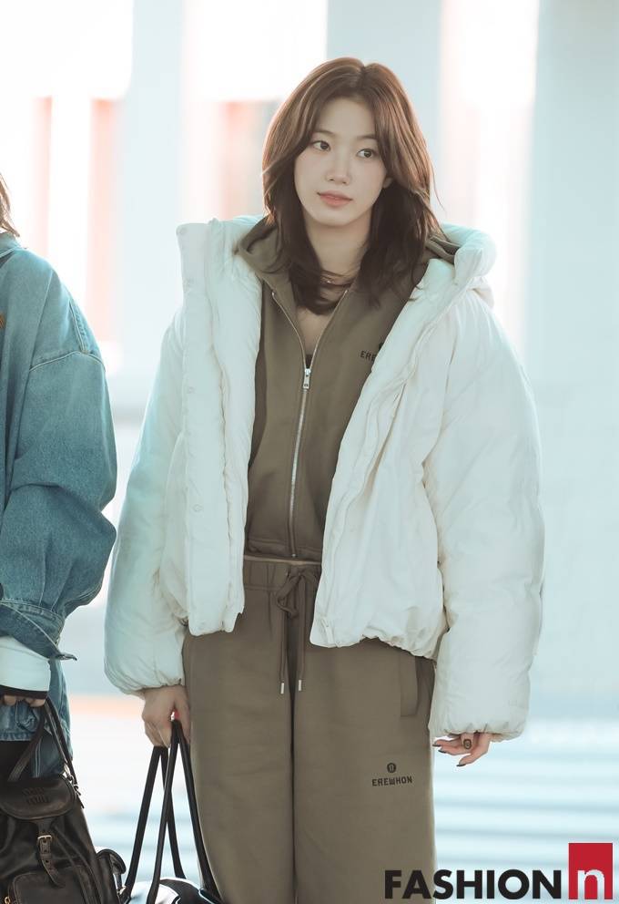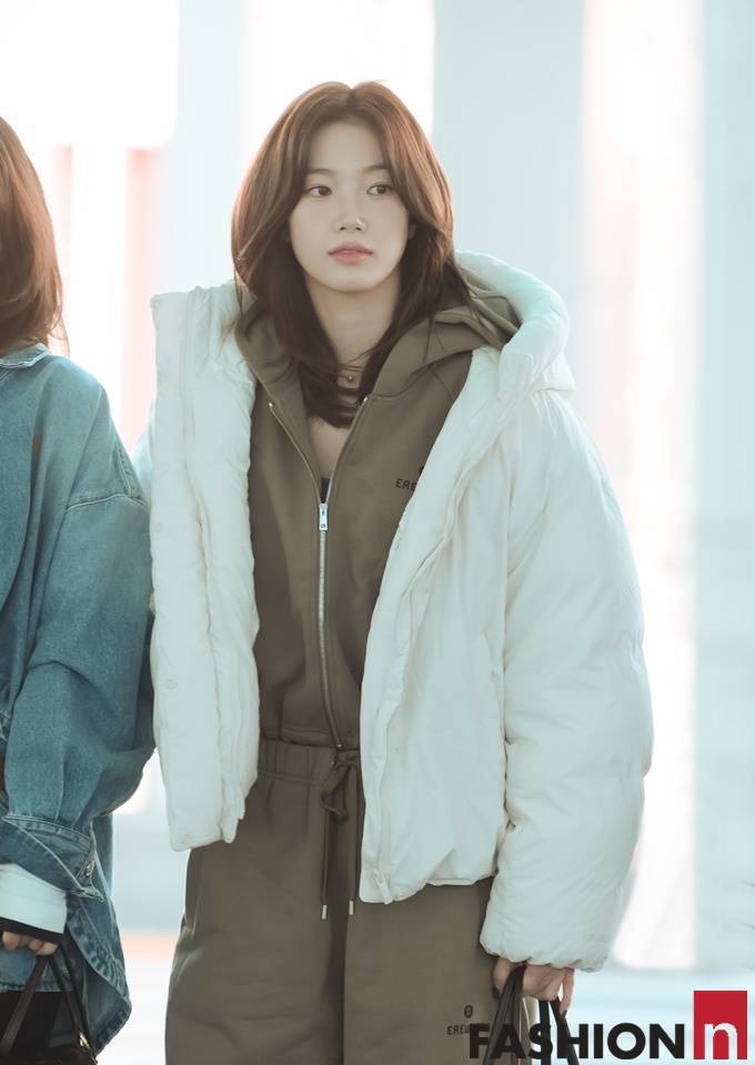 그룹 르세라핌 카즈하가 화이트 숏패딩으로 공항을 밝혔다.