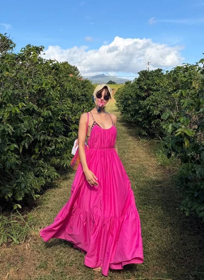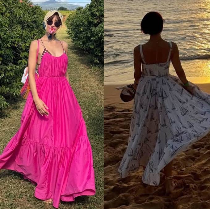 공개한 사진에서 최은경은 핫핑크 슬립 롱 원피스에 두건과 선글라스를 매치한 귀여우면서도 우아한 스타일을, 또 화이트 바탕에 블루 패턴이 들어간 슬립 원피스러 스타일리시한 리조트룩을 선보였다.