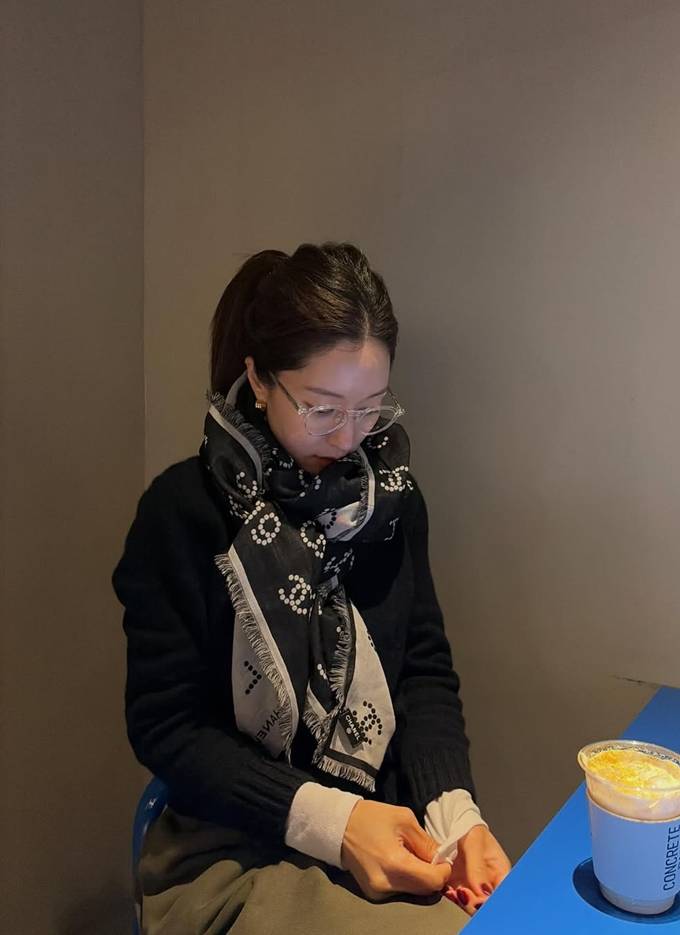 또 여기에 스카프 머플러를 두르고 뿔테 안경을 매치해 멋스러운 겨울 외출 스타일을 완성했다.