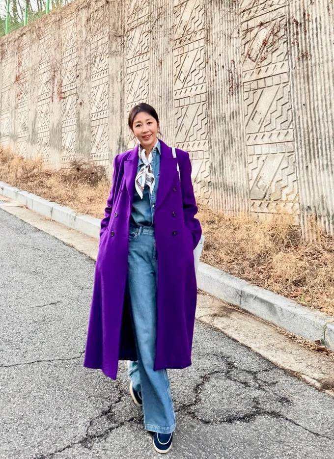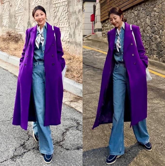 공개한 사진에서 전미라는 데님 팬츠와 데님 셔츠의 청청 패션에 클래식한 더블 버튼의 퍼플 롱 코트를 걸친 감각적인 컬러의 매치의 외출룩으로 시선을 단번에 사로잡았다.