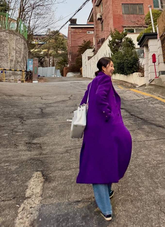 전미라, 퍼플 한 방으로 끝냈다! 시선올킬 청청에 퍼플 파워풀한 코트 외출룩
