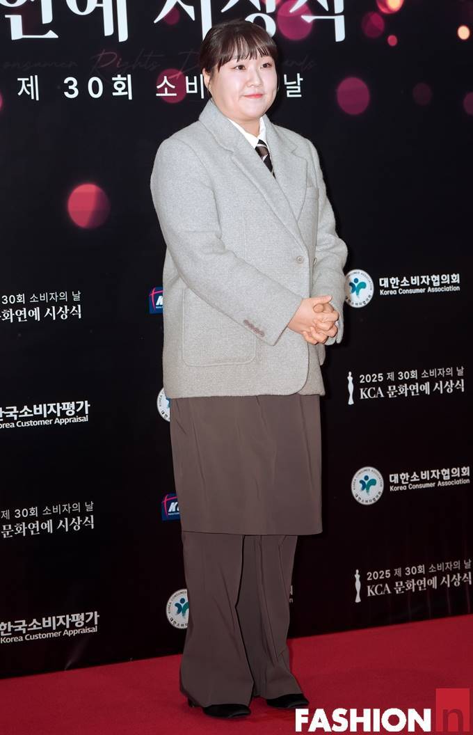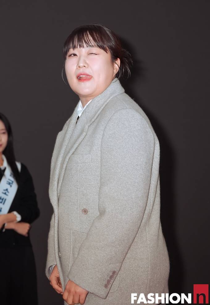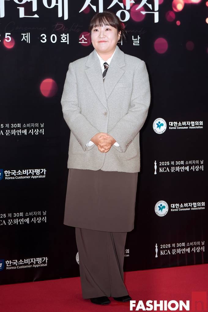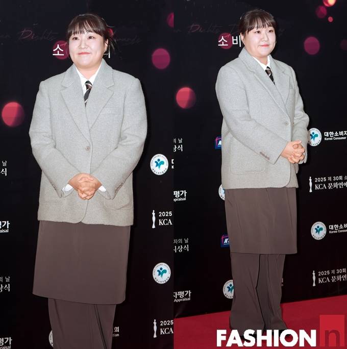 이날 이수지는 화이트 셔츠에 타이를 매고 그레이 재킷을 입고 브라운 컬러의 바지 위에 스커트를 매치한 슈트룩으로 단아하면서도 여성스러운 모습을 자아냈다.