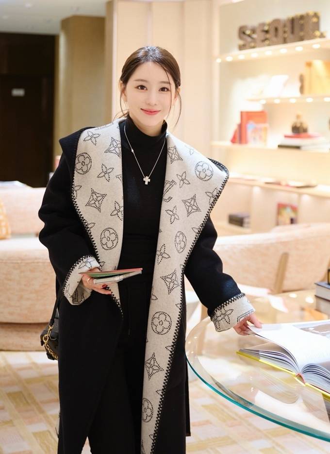 공개한 사진에서 황유주는 코트 안쪽에 다양한 로고가 디자인된 블랙 리버시블 코트룩으로 세련미 넘치는 단아한 미모를 드러냈다.