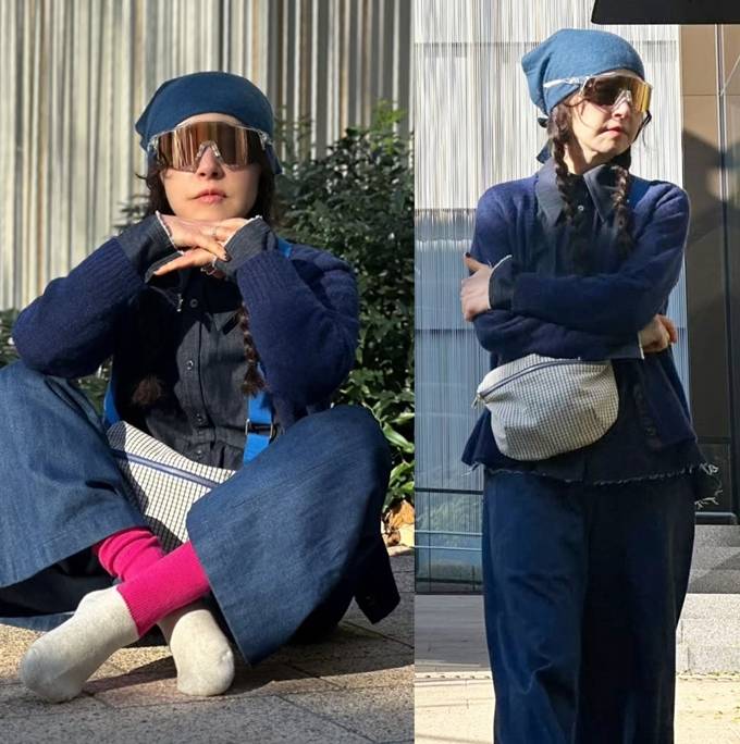 또 블랙 셔츠 위에 네이비 니트 카디건을 입고 와이드핏 데님 팬츠를 매치한 톤온톤 스타일로 60세 나이가 믿기지 않는 걸리시룩을 완성했다.