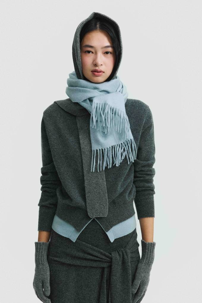 이 제품은 캐시미어 실을 이중 구조로 짜 형태 변형이 적고 탄탄하게 착용할 수 있어 다양한 겨울 코디에 활용도가 높다.