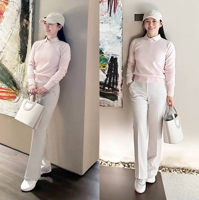 공개한 사진에서 박주미는 화이트 이너 위에 연한 핑크빛의 니트 스웨터를 이고 화이트 팬츠를 매치한 골프룩으로 단아하면서도 스포티한 분위기를 자아냈다.