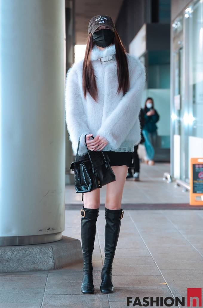 이날 장원영은 화이트 페이크 퍼 코트와 미니 스커트를 매치한 하의실종 시어링 프렌치룩으로 각선미를 뽐냈다.