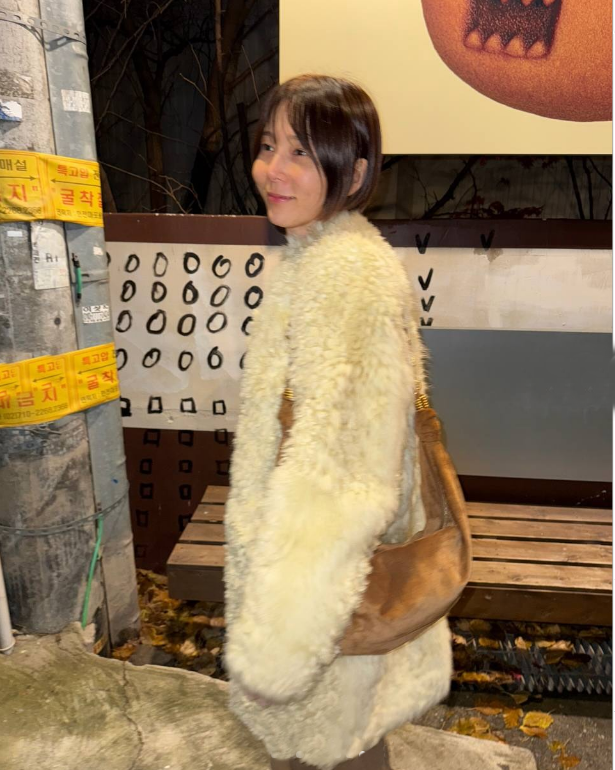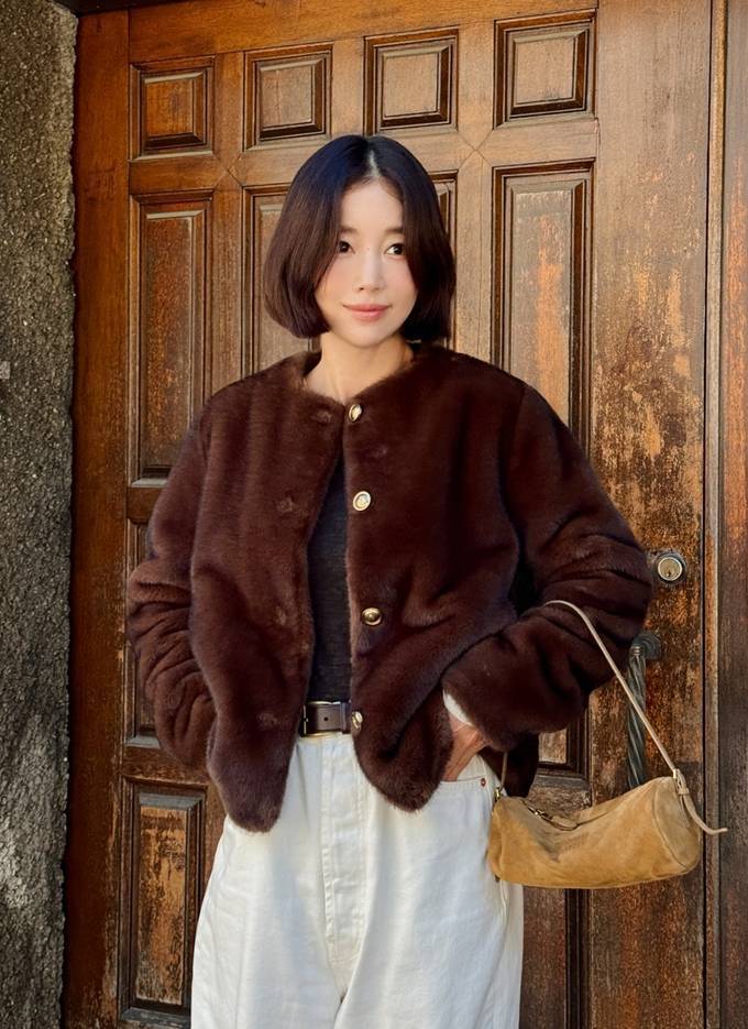 ▶ 채정안은 폭신한 느낌의 볼륨감이 눈에 띄는 하이넥 페이크 퍼 시어링 코트룩으로 매력적인 겨울 데일리룩을 연출했다.
