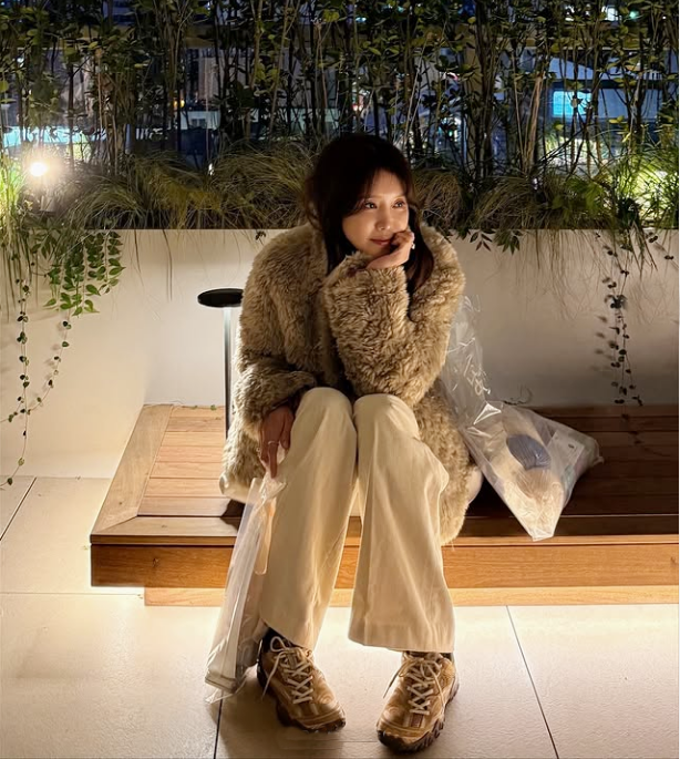 ▶ 김나영은 소재 표면의 풍성한 질감과 볼륨감이 강조한 포근한 시어링 코트룩으로 보기만해도 포근한 겨울 스타일링을 연출했다.