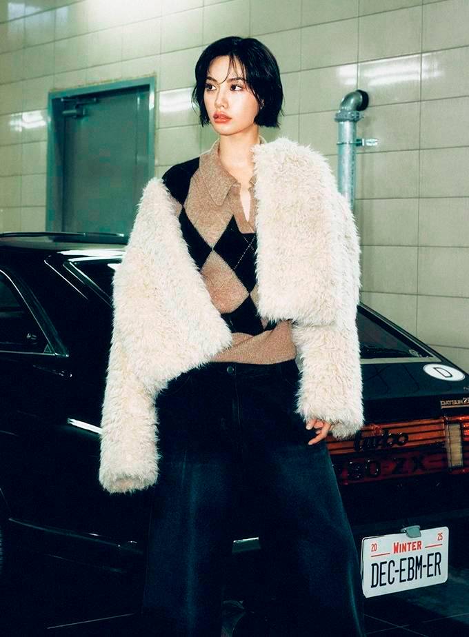 ▶ 배우 이주빈은 부드러운 터치와 은은한 광택감이 흐르는 하이넥 디자인의 페이크 재킷으로 세련되고 고급스러운 겨울 스타일을 완성했다.