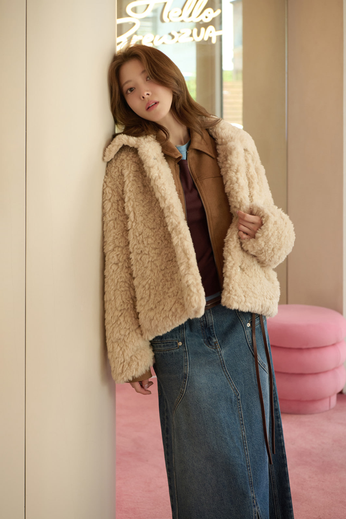 '메르시엔에스' 의 페이크 퍼 재킷은 테디베어 스타일의 숏 재킷으로 포근하고 부드러운 질감과 루즈핏 디자인으로트렌디한 겨울 아우터에 제격이다.