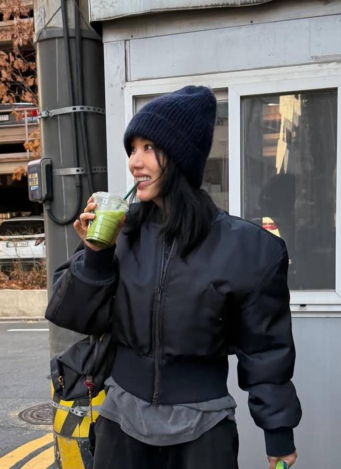 또 액세서리로 블랙 니트 비니와 크로스백을 매치해 내추럴하면서도 실용적인 스타일을 완성했다.