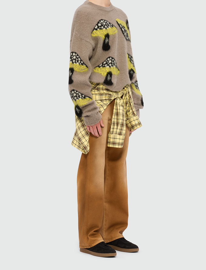 헤어리한 텍스처가 돋보이는 니트 풀오버는 앞면과 소매에 유니크한 버섯 패턴, 뒷면에는 미니멀한 MSGM 로고 라벨 디테일이 더해져 대담하고 개성 있는 무드를 더한다.