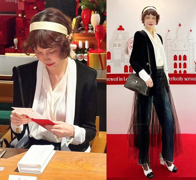 특히 짧은 헤어 스타일에 화이트 헤어 밴드를 하고 화이트 블라우스와 시스루 스커트를 매치해 우아한 페미닌 스타일을 완성했다.