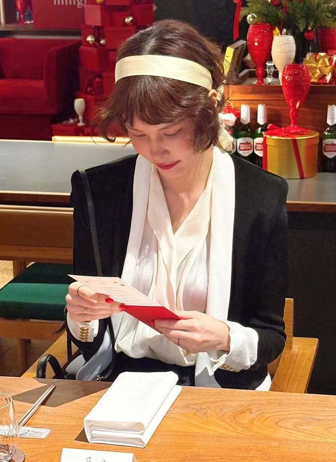 공개한 사진에서 송경아는 데님 팬츠 위에 블랙 시스루 스커트를 입고 화이트 블라우스 위에 블랙 재킷을 걸친 다이닝룩으로 우아하면서도 큐티한 스타일을 선보였다.
