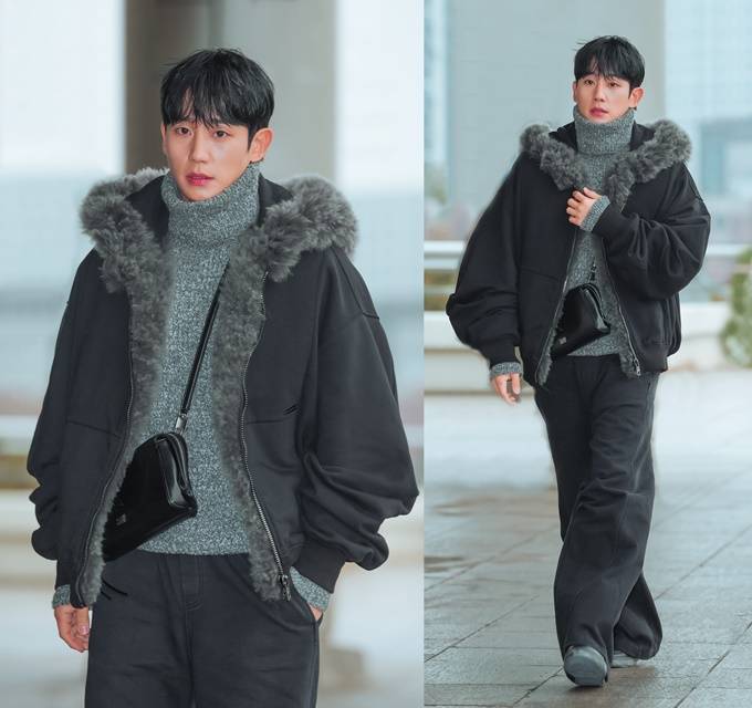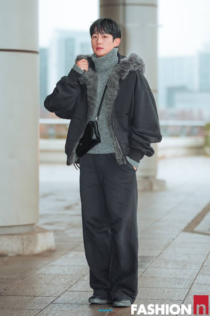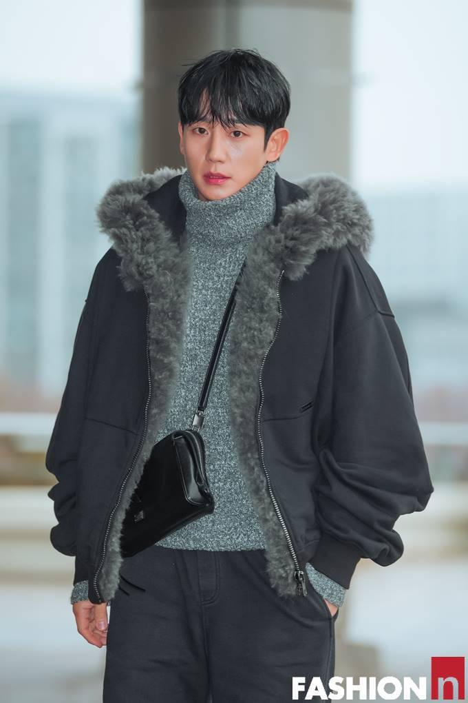 이날 정해인은 블랙 퍼 재킷에 이너로 그레이 터틀넥 니트 스웨터를 입고 와이드 블랙 팬츠를 매치한 톤온톤 스타일로 로맨틱하면서도 훈훈한 출국룩을 선보였다.