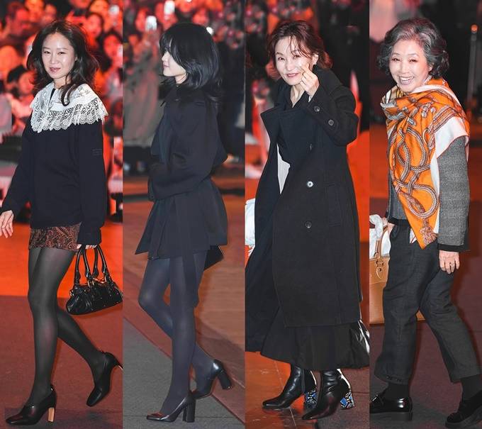 배우 고두심은 화려한 스카프를 두른 하객룩, 박경림은 블랙 러플 블라우스와 클래식한 발마칸 코트로 격식있는 하객패션을 연출했다.